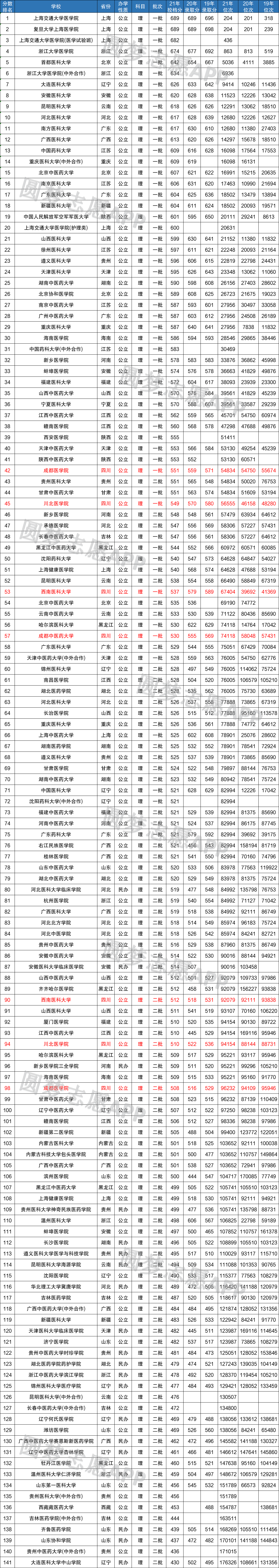 四川省是高考大省,高考人数众多,大部分的院校都会在四川进行招生,以下是近三年(2019~2021年)所有本科层次的医科类大学在四川省的招录数据:
