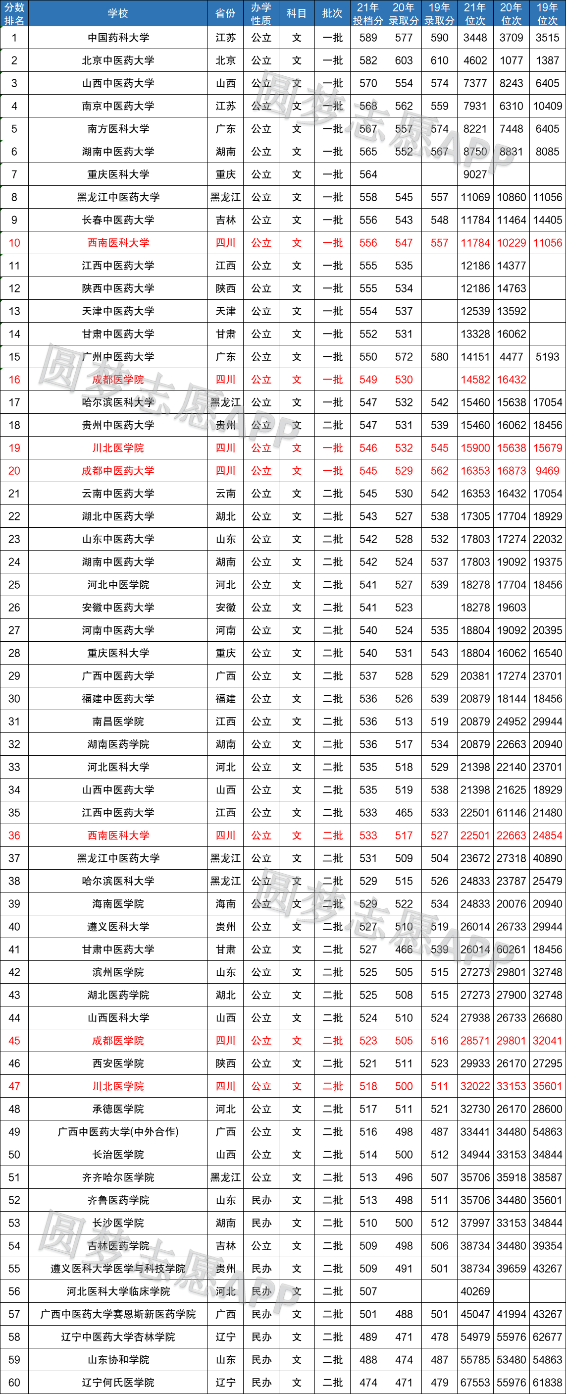 在四川文科中,收分较高的大学有中国药科大学、北京中医药大学、山西中医药大学、南京中医药大学、南方医科大学,它们2021年的投档分在567~589分之间,最低位次在3448~8221名。