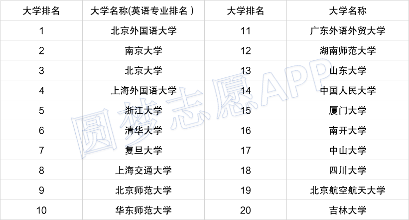 如上图所示,英语专业最好的大学是北京外国语大学,其次是南京大学,第三名是北京大学。