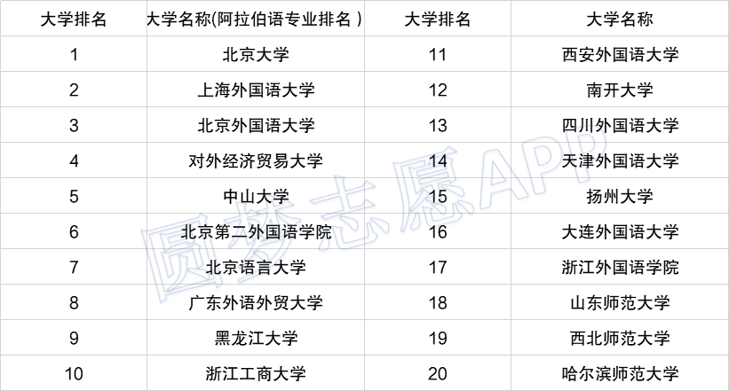 如上图所示,阿拉伯语专业最好的大学是北京大学、其次是上海外国语大学,然后第三名是北京外国语大学。