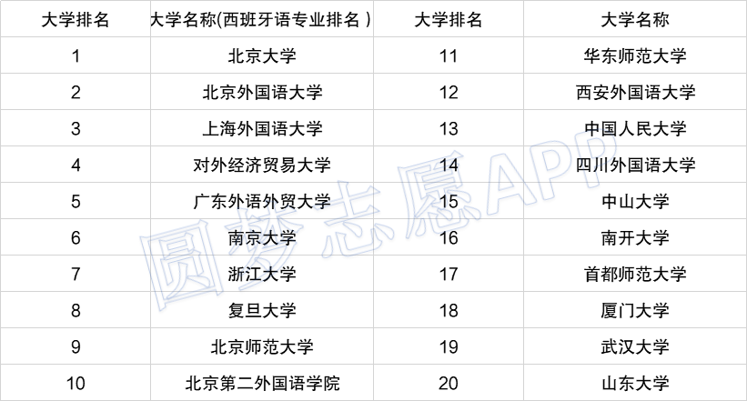如上图所示,西班牙语专业最好的大学是北京大学,其次是北京外国语大学,然后第三名是上海外国语大学。