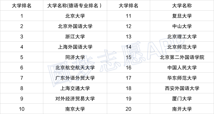 如上图所示,德语专业最好的大学是北京大学,其次是北京外国语大学,然后第三名是浙江大学。