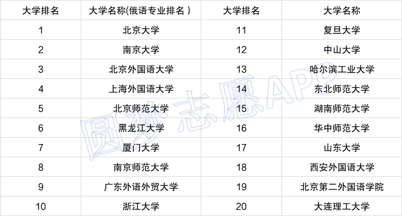 如上图所示,俄语专业最好的大学是北京大学,其次是南京大学,然后第三名是北京外国语大学。