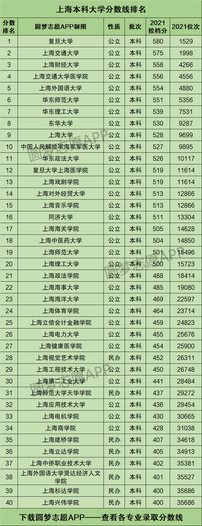 本文将为大家奉上上海市内所有的本科大学2021年的招生录取分数线排名汇总,供2022年上海市高考生查阅!