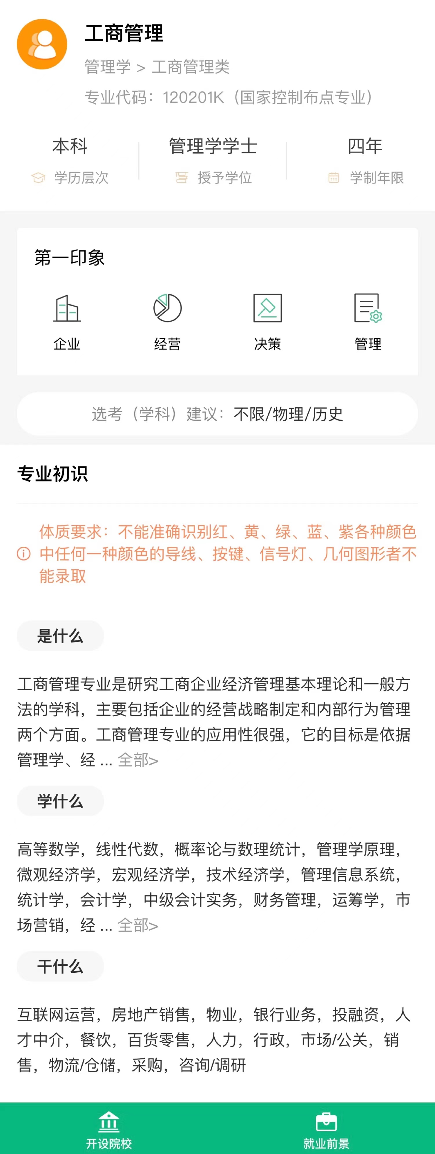 由于篇幅有限,小编就不一一介绍所有专业了。大家如果想了解详细的情况,可以去里查询。该软件会通过“是什么”、“学什么”和“干什么”三个角度向大家全面介绍专业。对一些特殊的专业,还整理了体质要求和报考限制。