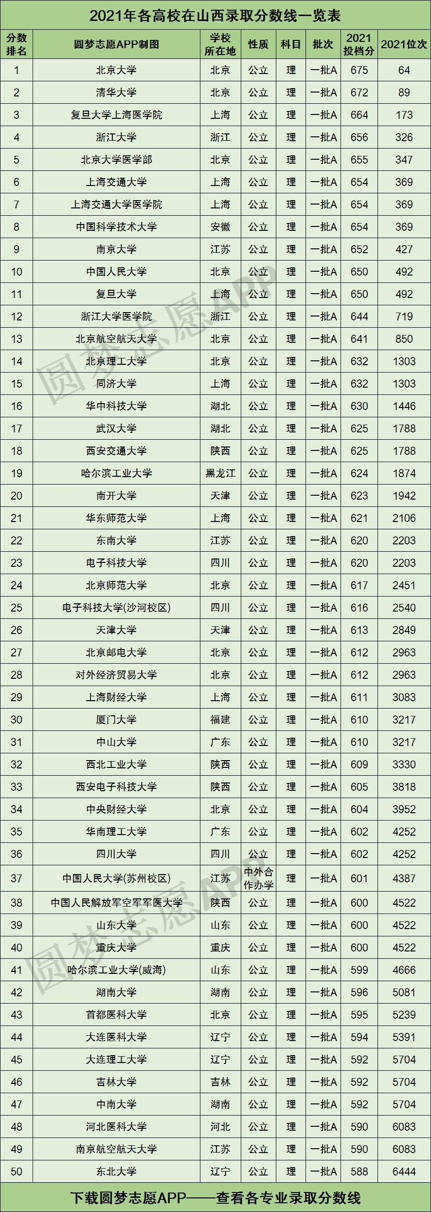 根据上图可知,2021年高考山西理科高三同学,只有成绩在588分以上、排在全省理科考生的前6444名,才有机会被全国前50强大学给录取!
