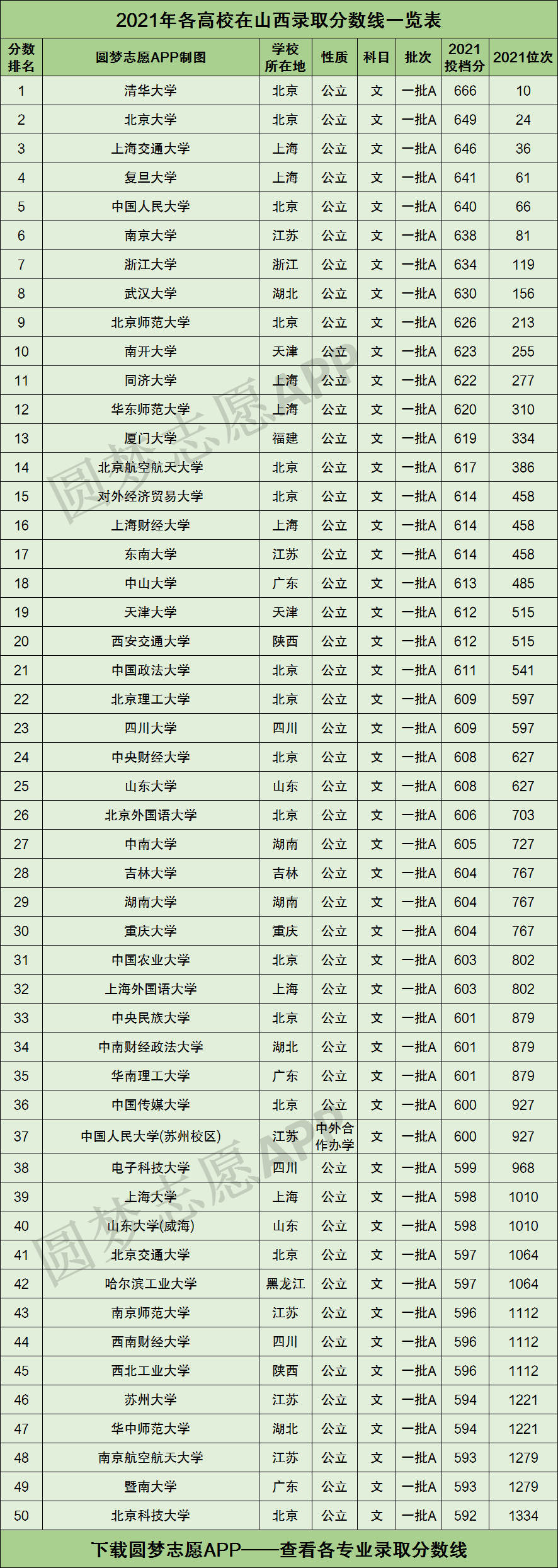 根据上图可知,2021年山西高三文科考生,只有成绩考到了592分以上、在全省文科考生中排名前1334名,才有机会被全国50强大学录取!