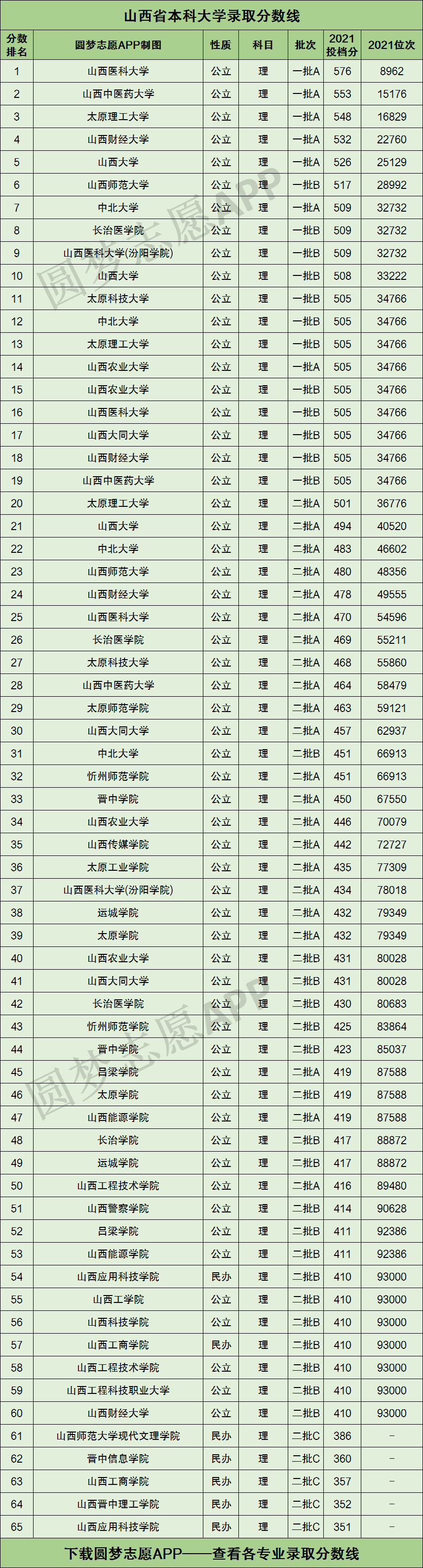 二、2021年各高校在山西录取分数线一览表