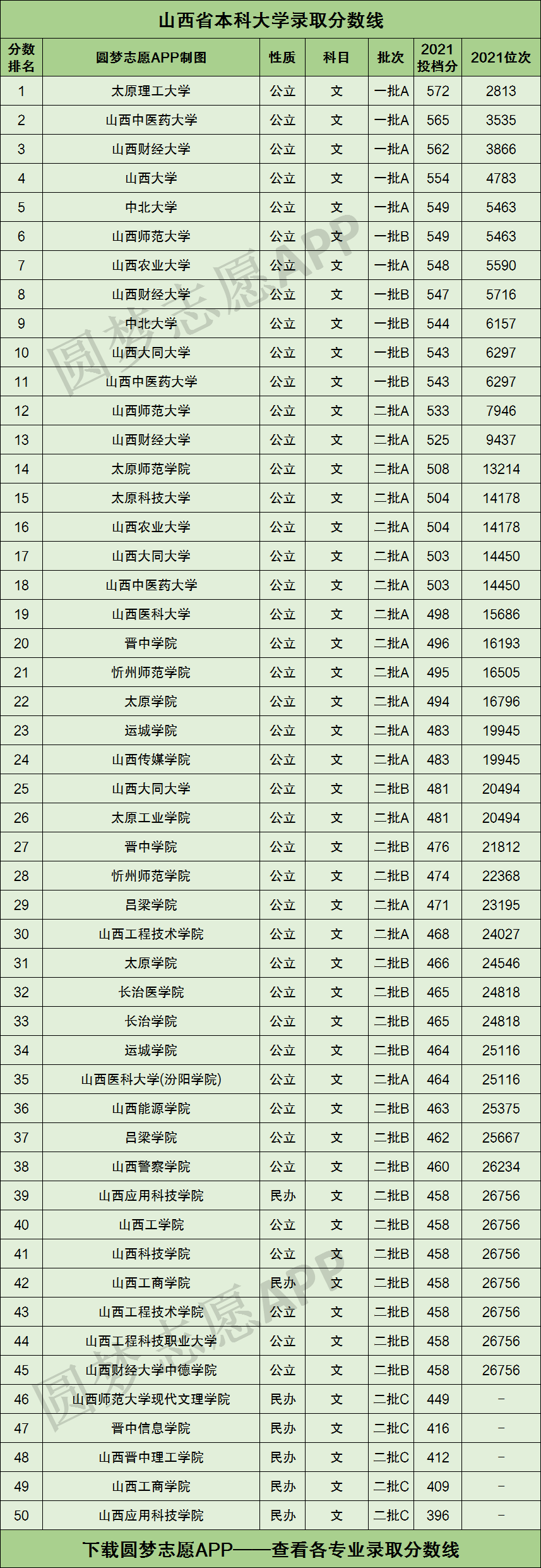 根据山西省考试院公布的数据,按照文科投档分数线的高低排序,为大家整理出了下图这份山西省内的所有本科大学文科录取分数线排名榜单: