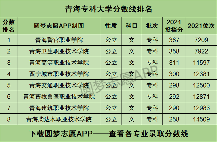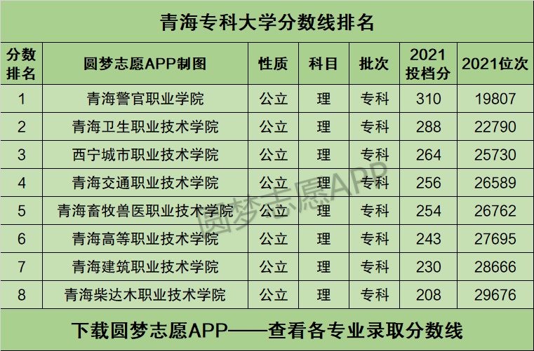 本文将为大家奉上青海省内所有的专科大学2021年的招生录取分数线排名汇总,供2022年青海省高考生查阅!