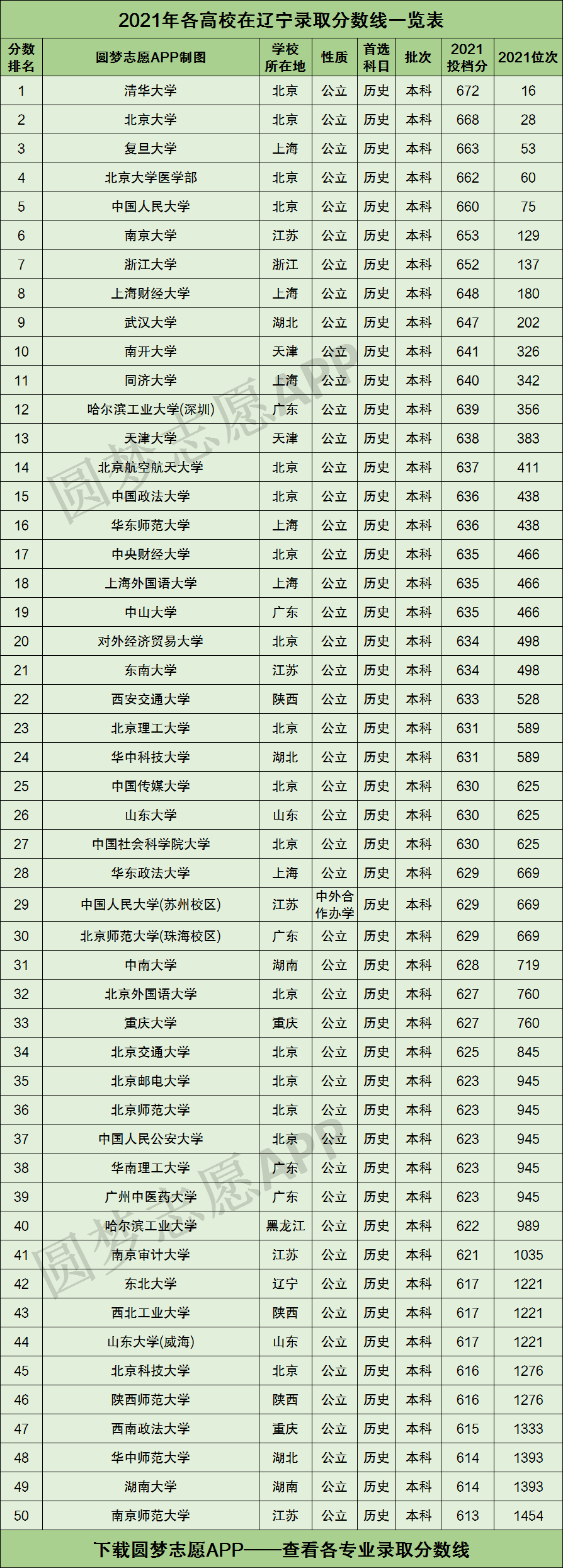 根据上图可知,2021年辽宁高三文科考生,只有成绩考到了613分以上、在全省文科考生中排名前1454名,才有机会被全国50强大学录取!