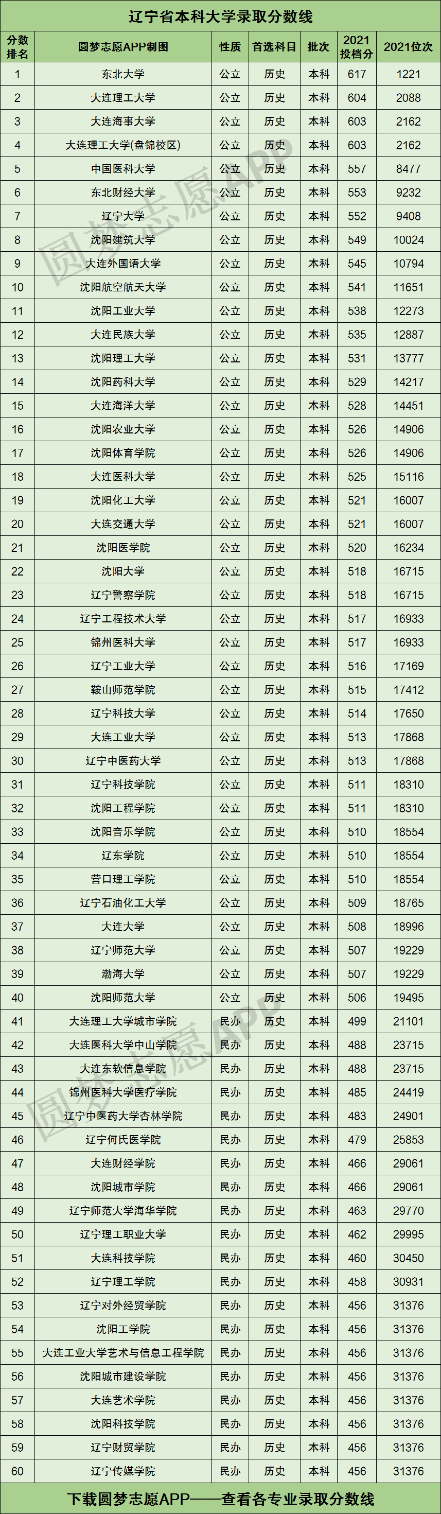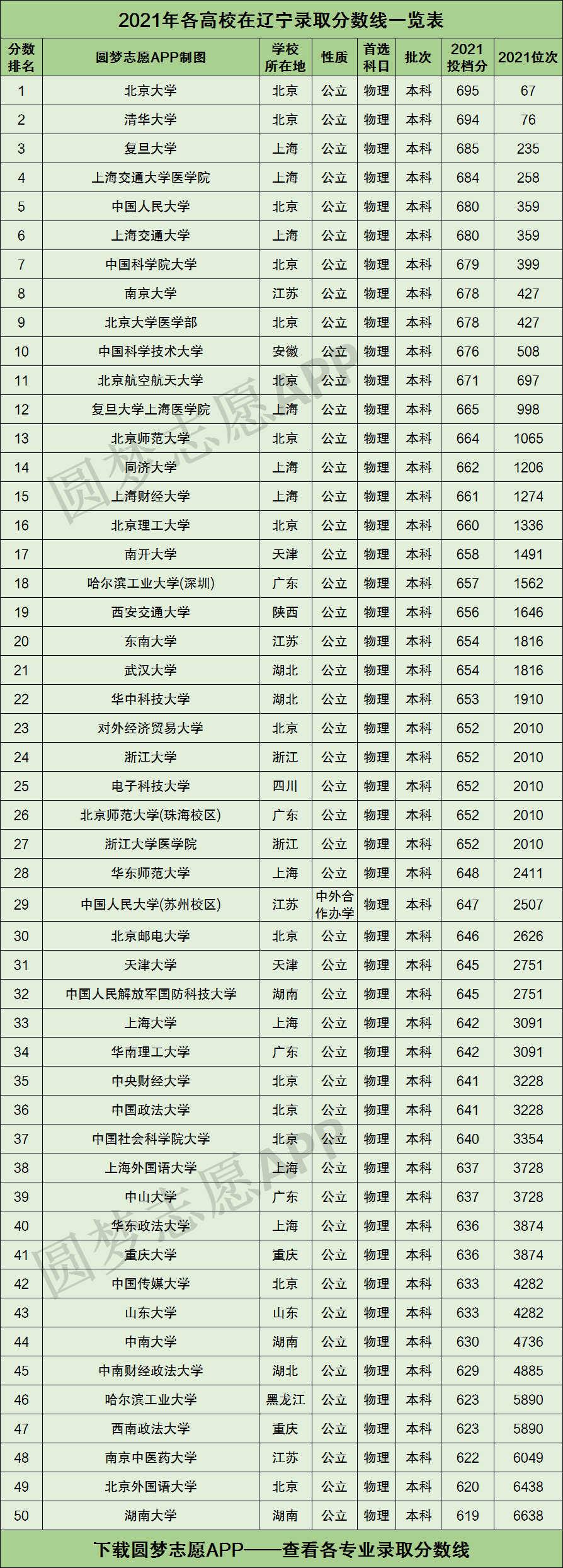 对于不想留在辽宁省读大学的高三同学来说,全国各地的高校在辽宁省的录取分数线则才是一份最有价值的参考资料。不过本文由于篇幅有限,将仅为大家展示2021年各高校在辽宁录取分数线最高的前50所大学,如果你想查看全国近3000所大学在辽宁省的录取分数线排名,可以在中直接EXCEL表格。