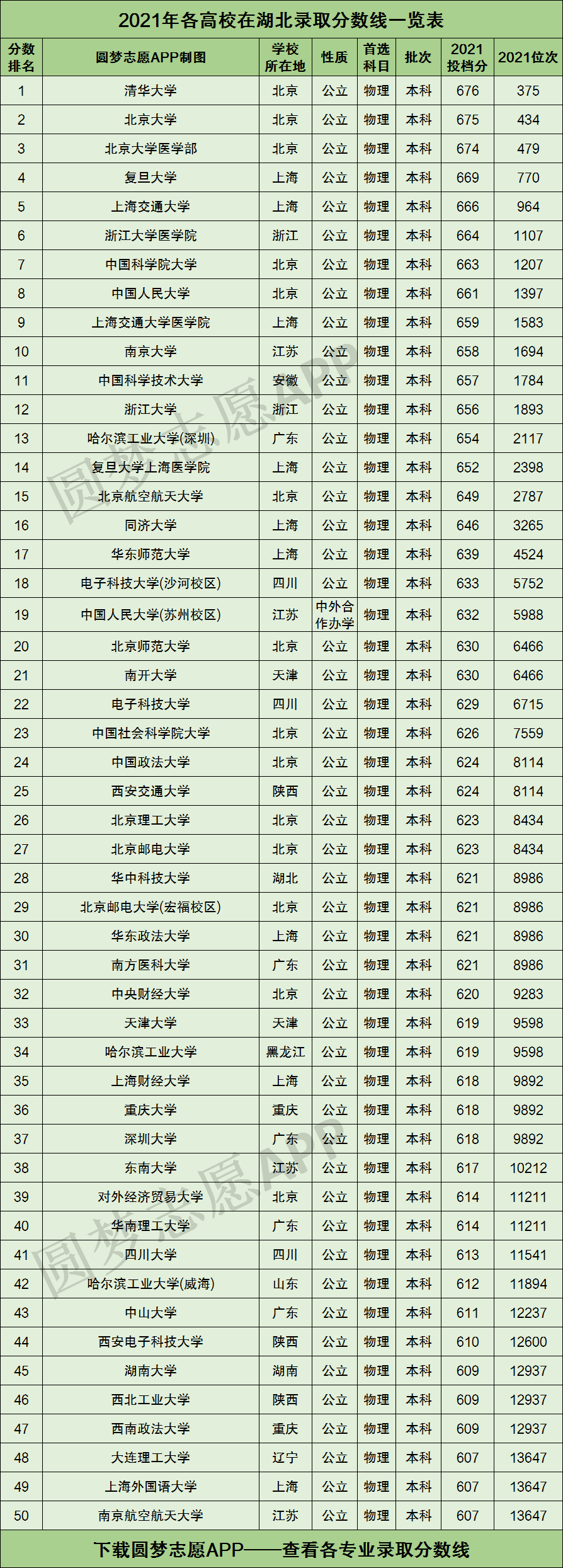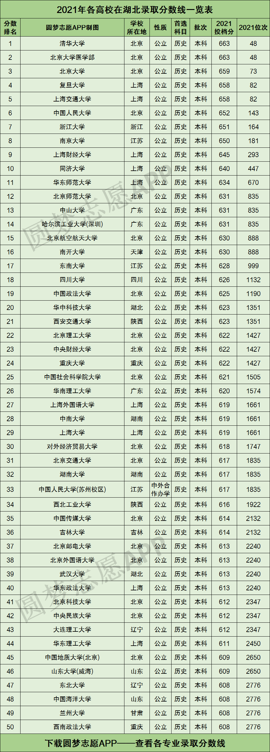 对于不想留在湖北省读大学的高三同学来说,全国各地的高校在湖北省的录取分数线则才是一份最有价值的参考资料。不过本文由于篇幅有限,将仅为大家展示2021年各高校在湖北录取分数线最高的前50所大学,如果你想查看全国近3000所大学在湖北省的录取分数线排名,可以在中直接EXCEL表格。