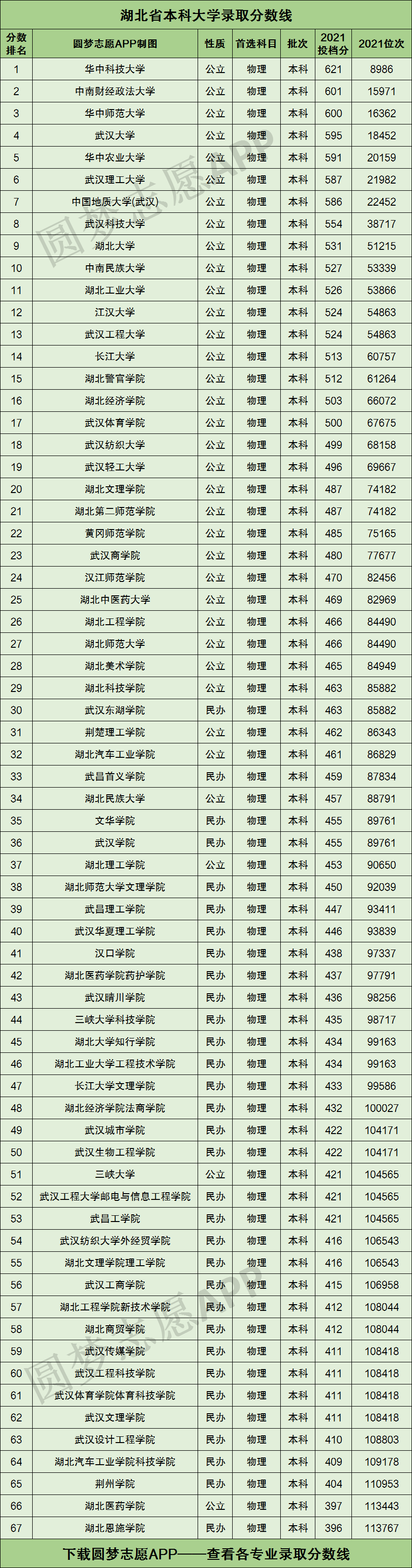 “湖北省内的所有本科大学2021年高考录取分数线是多少分”,是2022年湖北高考生报考大学时非常有价值的参考资料。本文将为大家奉上2021年各高校在湖北省文首选物理的录取分数线排名一览表,希望能帮助湖北省内的高考生成功拿到目标大学的录取通知书!