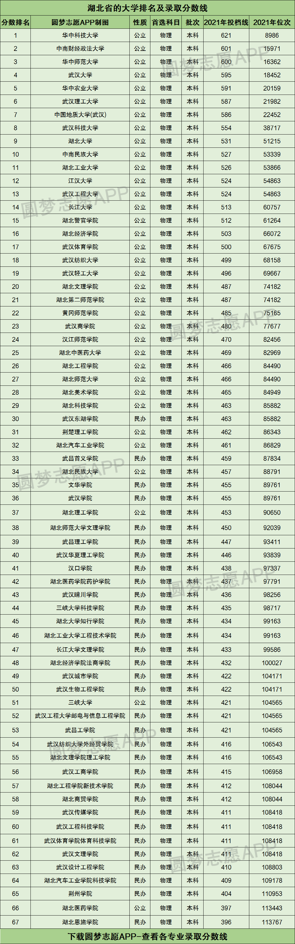 下图为湖北省的大学排名,以2021年本科(首选物理科目)投档分数线的高低为标准进行排序: