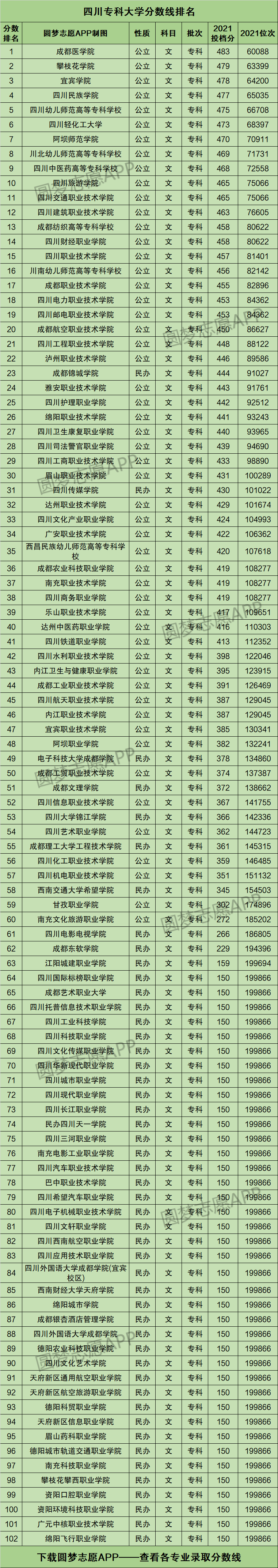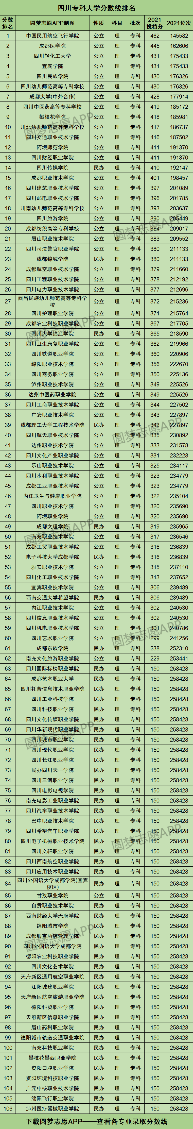 由于四川省内专科大学数据量较多,这里就不一一例举,您可在下文图片中查看省内全部学校在专科的录取分数线排名!