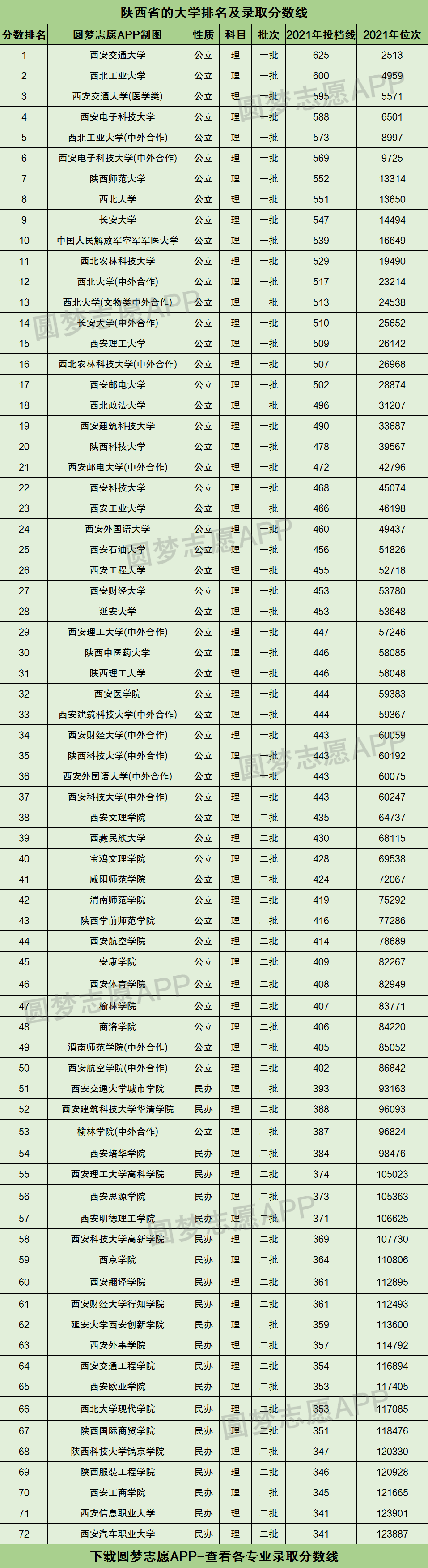 一、陕西省的大学排名及录取分数线2021年(理科)