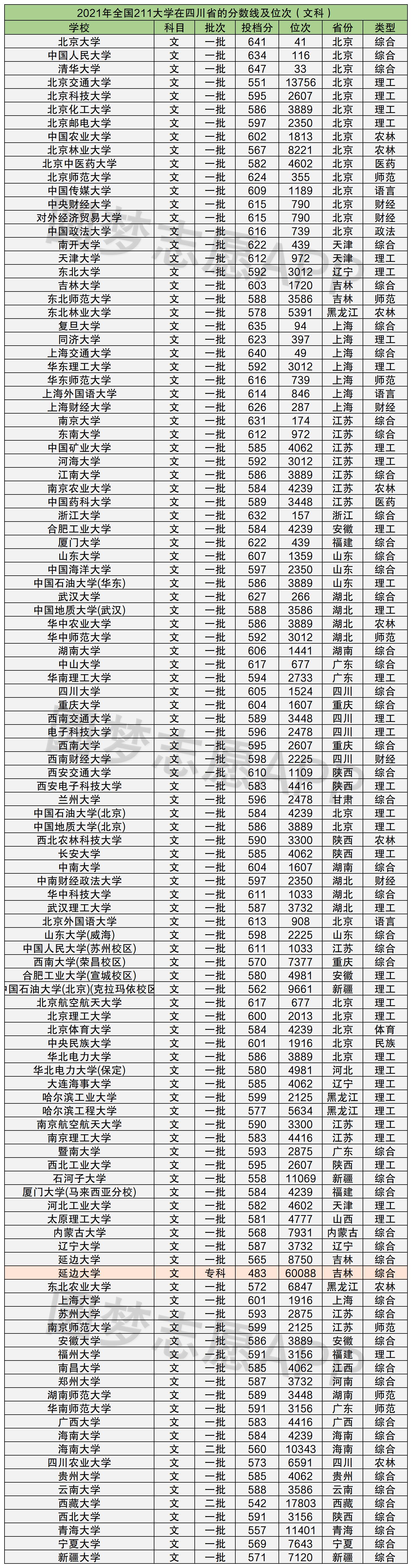 从下表来看,2021年全国211大学在四川省本科最低投档分数为西藏大学,542分,其次是北京交通大学,551分;另外值得注意的是,2021年延边大学在四川省有专科批次,投档分数为483。