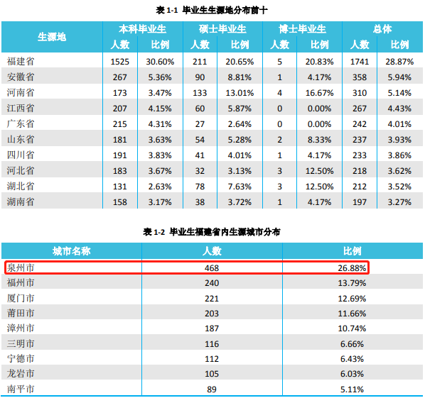 根据华侨大学2020年毕业生就业报告中关于生源地分布的统计,该校本科毕业生有30.60%来自福建省,福建省的主要生源城市排名第一的就是泉州市,人数共计468人,占福建省生源人数的26.88%。华侨大学的招生计划中有专门面向泉州考生的名额,2021年就有200个招生名额是仅面向泉州市的。
