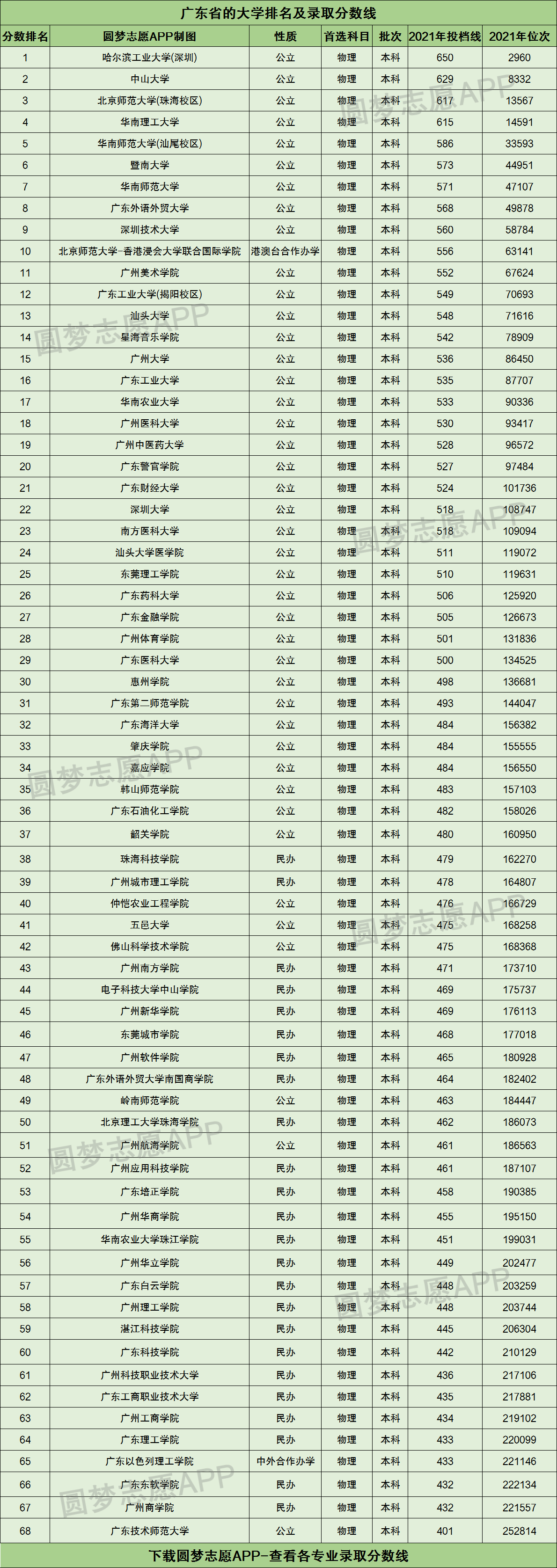 下图为广东省的大学排名,以2021年本科(首选物理科目)投档分数线的高低为标准进行排序:
