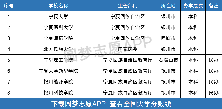 下图为宁夏回族自治区所有本科大学名单一览表,供大家查阅: