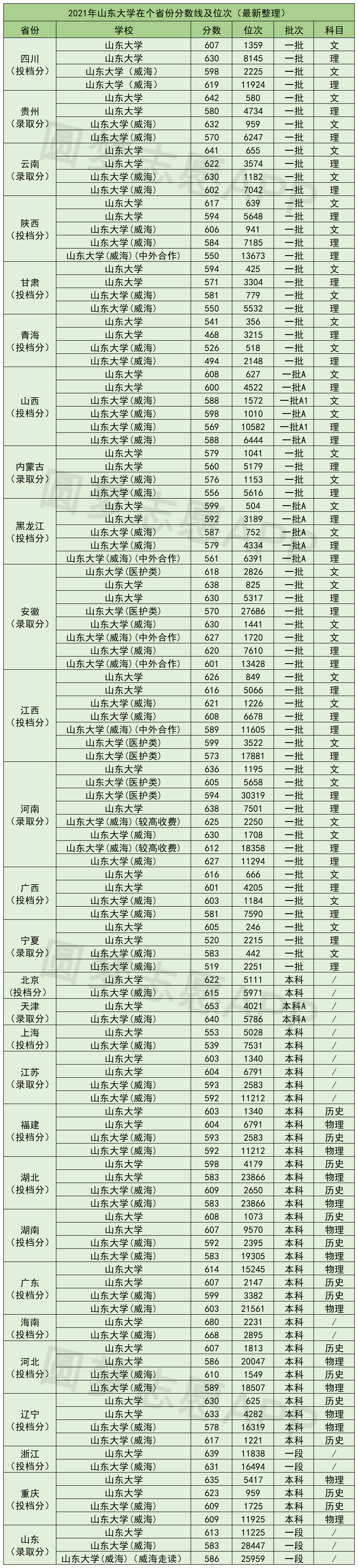 下面是2021年山东大学在全国各省份的分数线、对应位次、批次、科目一览表:
