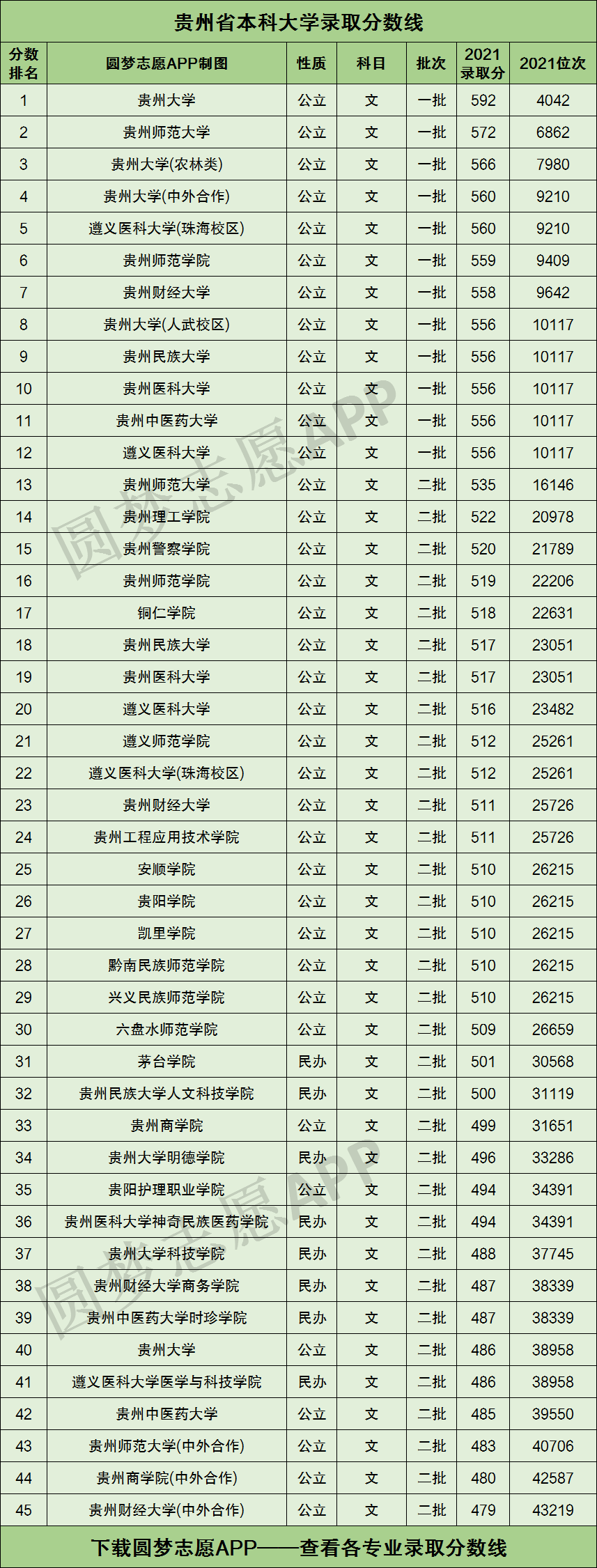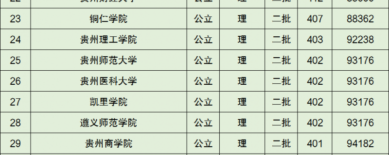 根据贵州省考试院公布的数据,按照文科录取分数线的高低排序,为大家整理出了下图这份贵州省内的所有本科大学文科录取分数线排名榜单: