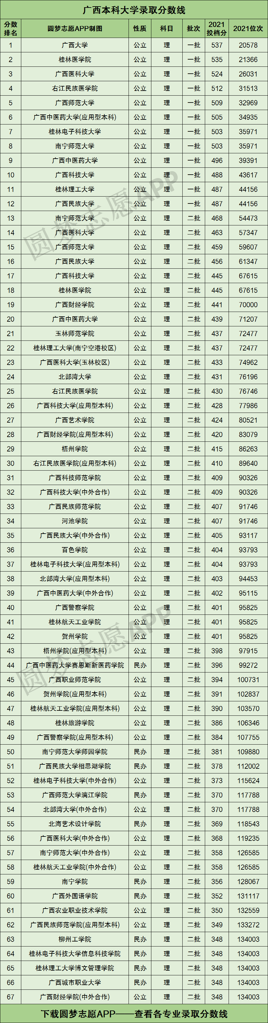 根据考试院的数据,为大家整理了广西自治区内所有本科大学2021年高考理科的投档分数线及位次排名。具体见下图: