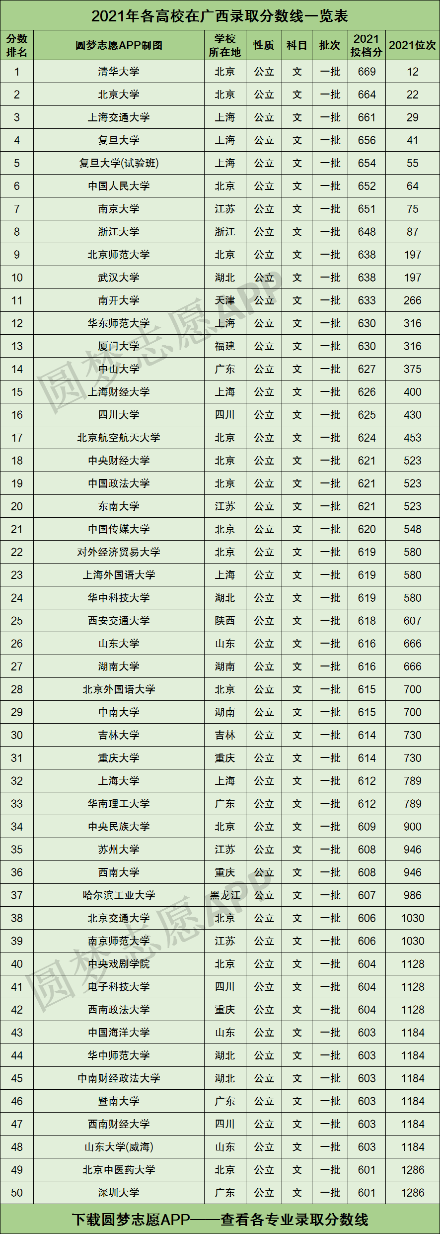 根据上图可知,2021年广西高三文科考生,只有成绩考到了601分以上、在区文科考生中排名前1286名,才有机会被全国50强大学录取!
