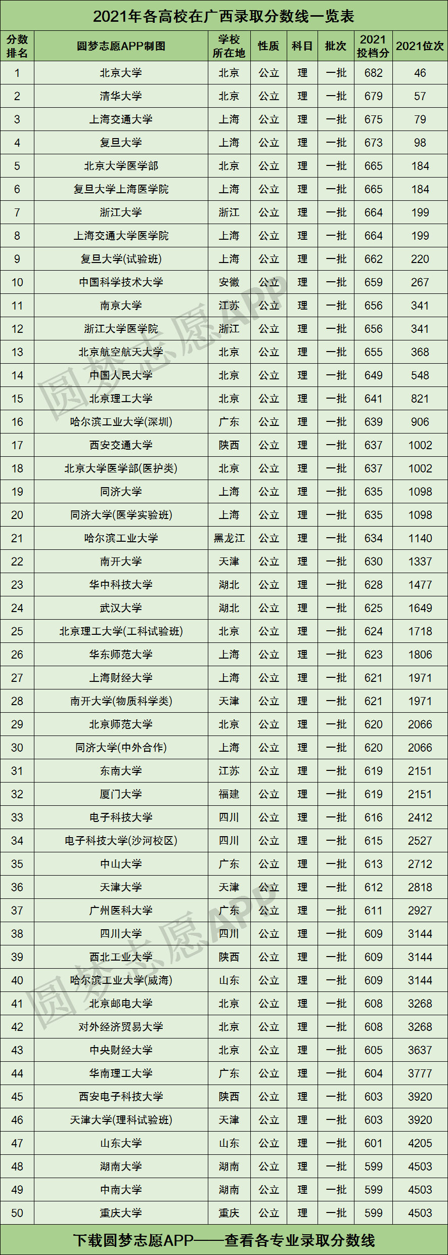 对于不想留在广西自治区读大学的高三同学来说,全国各地的高校在广西自治区的录取分数线则才是一份最有价值的参考资料。不过本文由于篇幅有限,将仅为大家展示2021年各高校在广西录取分数线最高的前50所大学,如果你想查看全国近3000所大学在广西自治区的录取分数线排名,可以在中直接EXCEL表格。