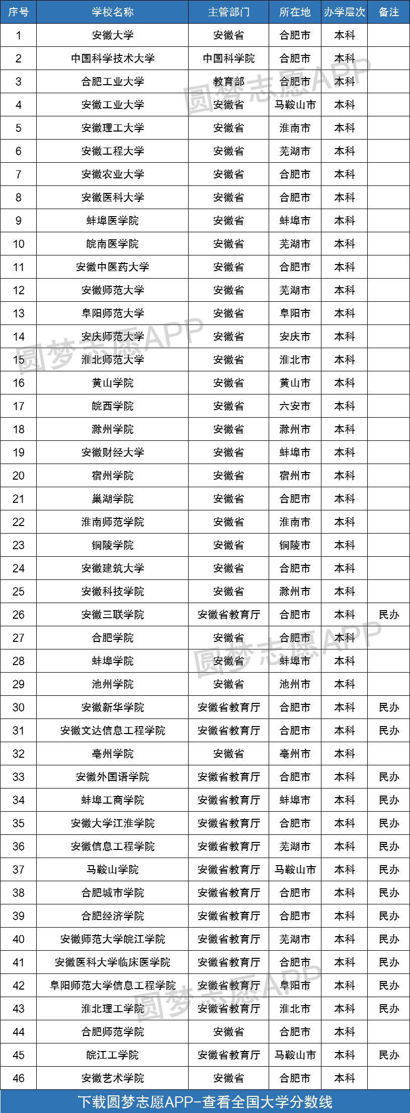 根据教育部发布的《全国高等学校名单》可知,安徽省内一共有46所本科大学,其中31所为公办本科、15所为民办本科院校。