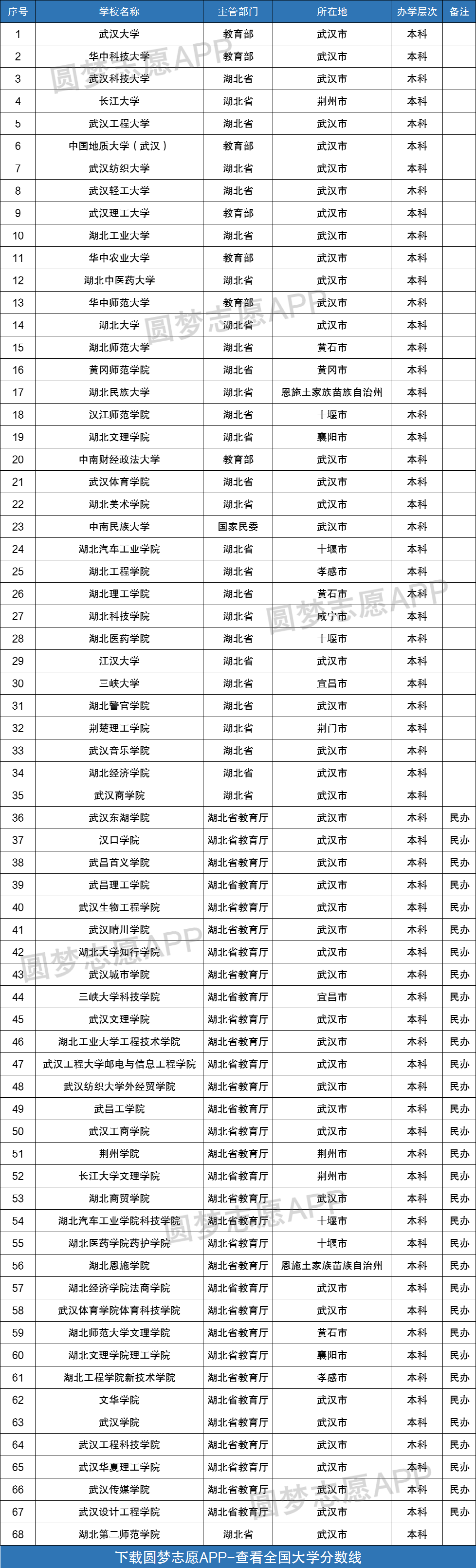 根据教育部发布的《全国高等学校名单》可知,湖北省内一共有68所本科大学,其中36所为公办本科、32所为民办本科院校。