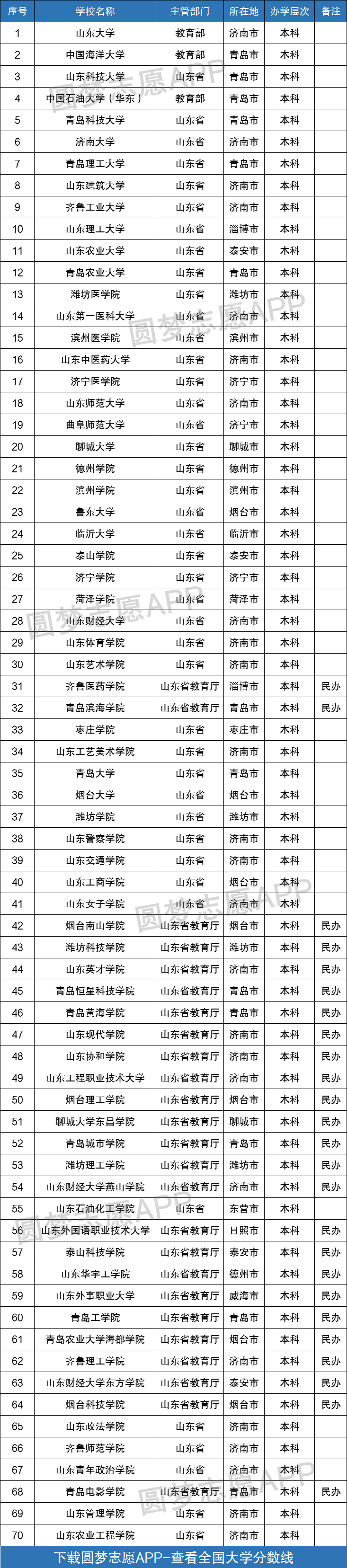 根据教育部发布的《全国高等学校名单》可知,山东省内一共有70所本科大学,其中45所为公办本科、25所为民办本科院校。
