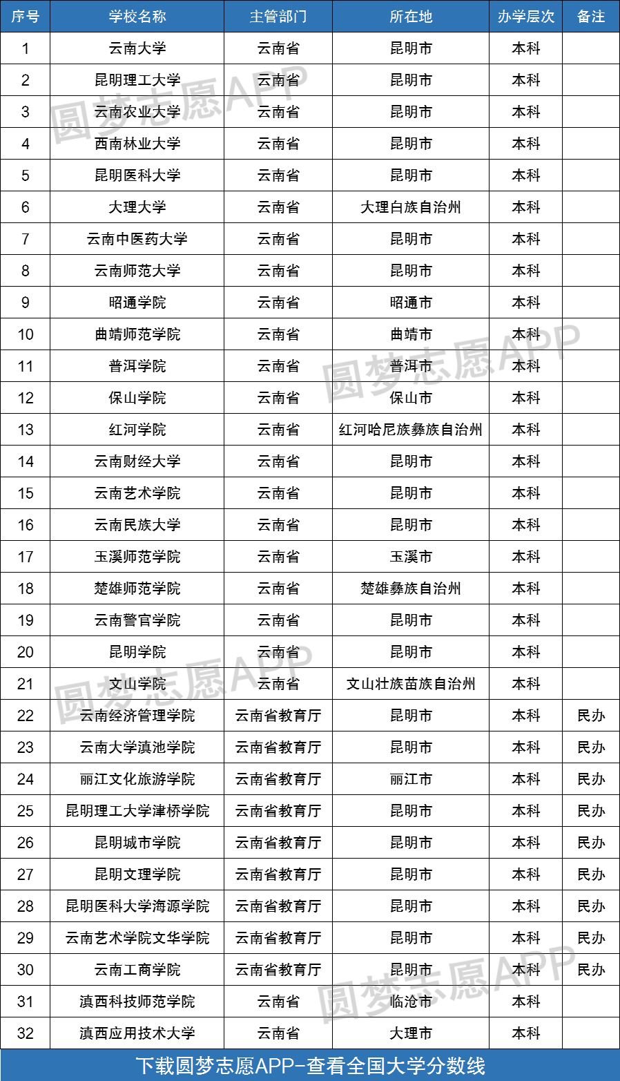下图为云南省所有本科大学名单一览表,供大家查阅: