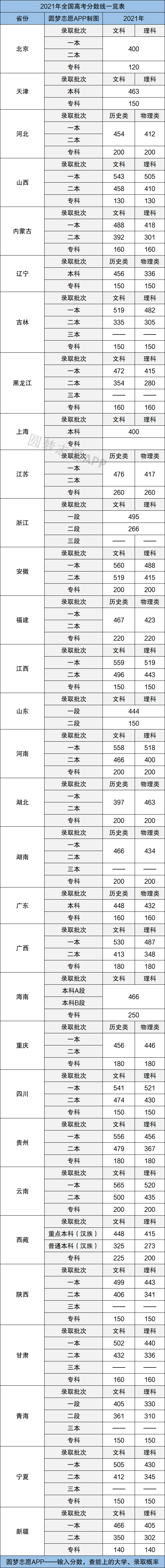 根据各省教育考试院2021年划定的批次线,老师将所有省份2021年本科、专科批次线整理为了一份表格,如下: