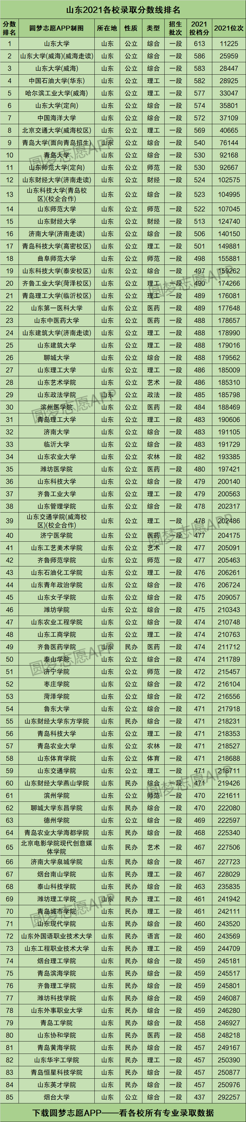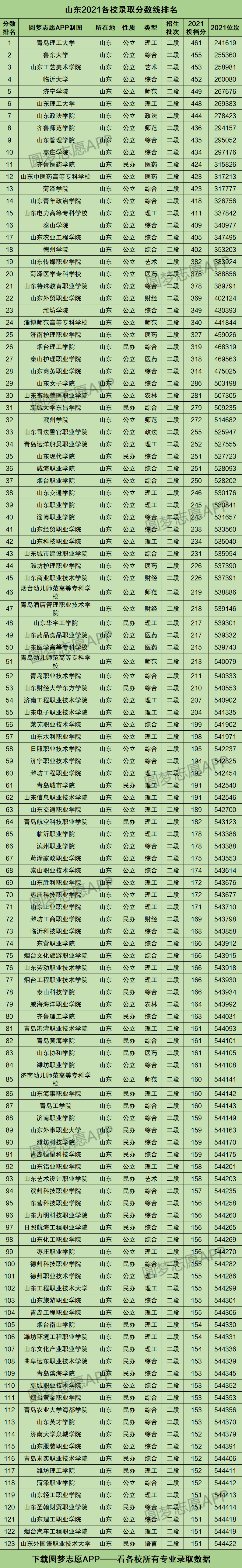 二、山东2021各校录取分数线排名