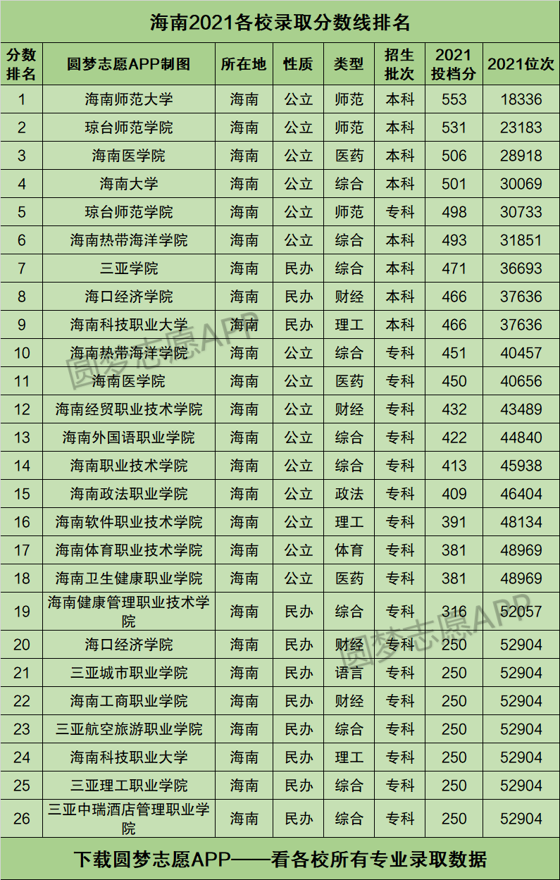 海南省内有哪些本科大学、高职专科院校?海南省内各大高校2021年在海南省的最低录取分数线及位次排名是多少?本文将为大家奉上这份名单及数据资料,并且再附上2021年海南高考本科分数线汇总,供2022年的高三同学们参考!