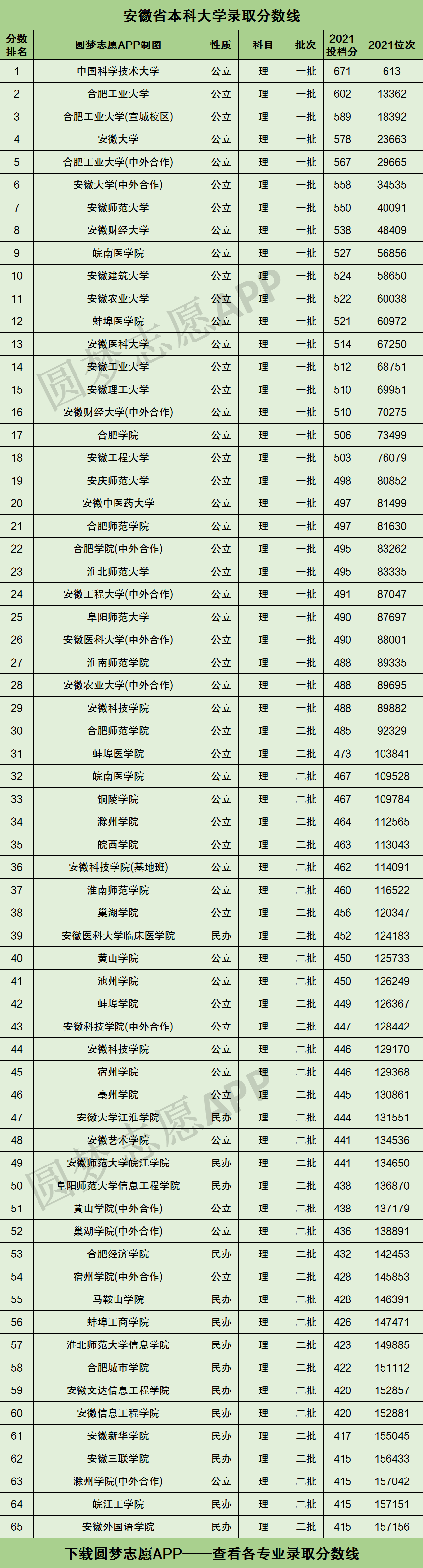 根据考试院的数据,为大家整理了安徽省内所有本科大学2021年高考理科的投档分数线及位次排名。具体见下图: