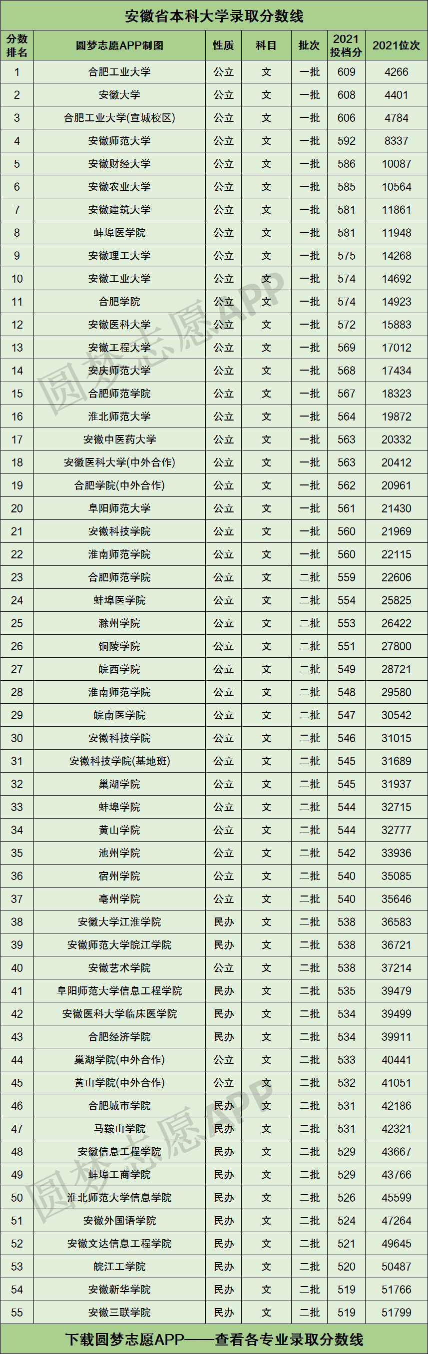 根据安徽省考试院公布的数据,按照文科投档分数线的高低排序,为大家整理出了下图这份安徽省内的所有本科大学文科录取分数线排名榜单: