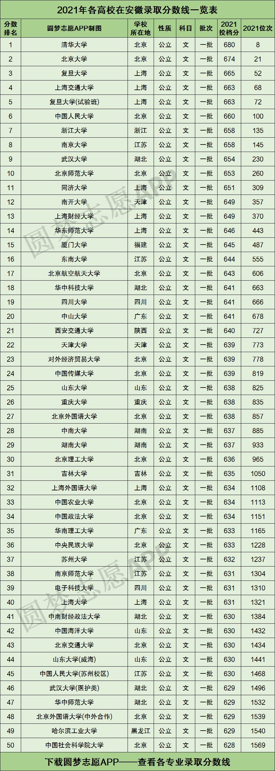 根据上图可知,2021年安徽高三文科考生,只有成绩考到了628分以上、在全省文科考生中排名前1569名,才有机会被全国50强大学录取!