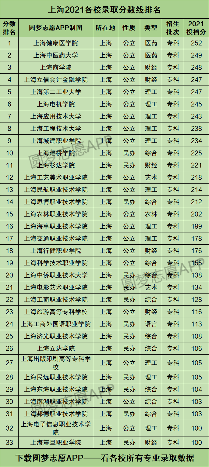 3、上海2021各校录取分数线排名(专科)