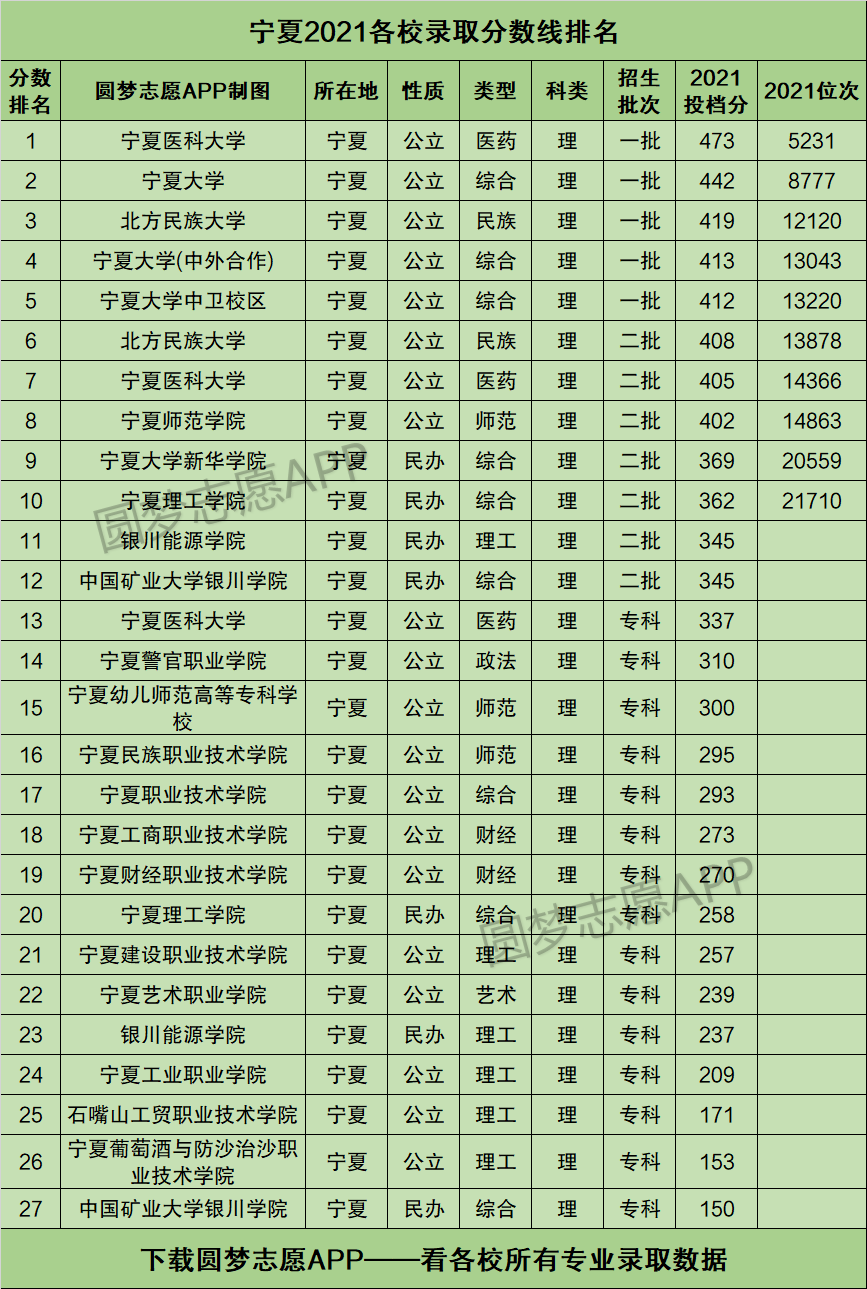 1、宁夏2021各校录取分数线排名(理工类)