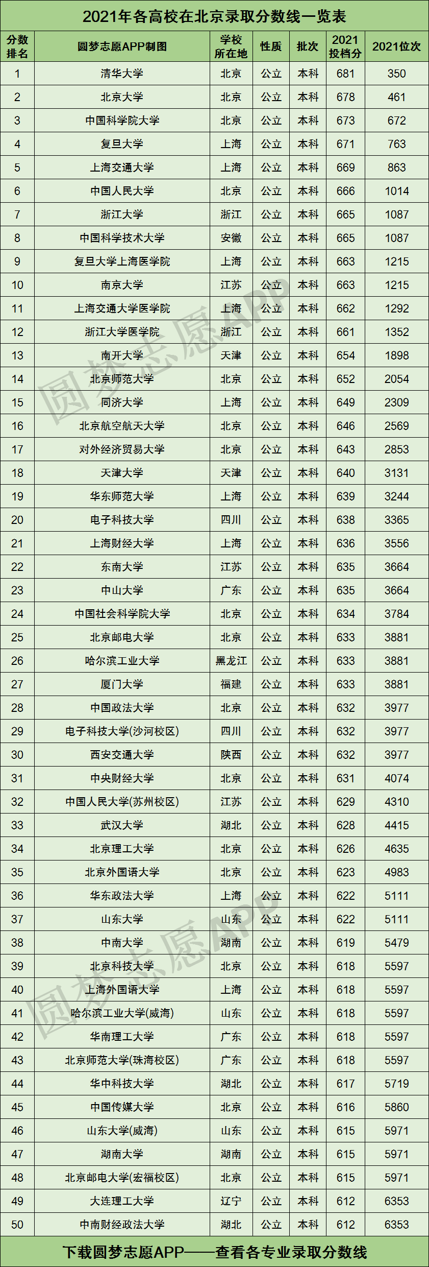对于不想留在北京市读大学的高三同学来说,全国各地的高校在北京市的录取分数线则才是一份最有价值的参考资料。不过本文由于篇幅有限,将仅为大家展示2021年各高校在北京录取分数线最高的前50所大学,如果你想查看全国近3000所大学在北京市的录取分数线排名,可以在中直接EXCEL表格。