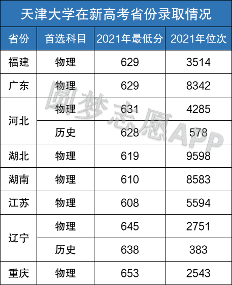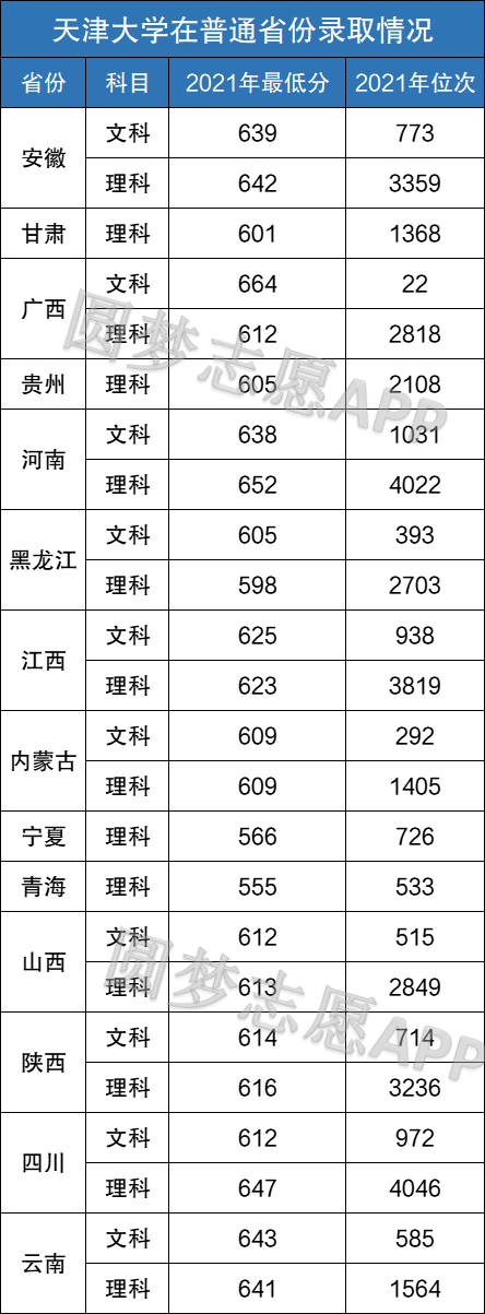 2021年天津大学除了在宁夏、青海两个省份是566分和555分录取之外,其余省份都是以600分以上的成绩录取。而之所以天津大学在这两个省份录取较低,主要原因还是因为这两个省份的考生较少,为了保证生源,所以会出现收分较低的存在。