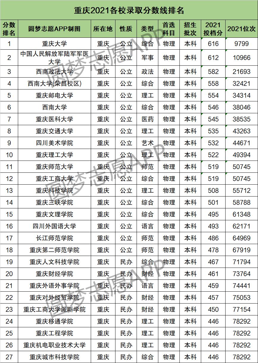 1、重庆2021各校录取分数线排名(本科首选物理)