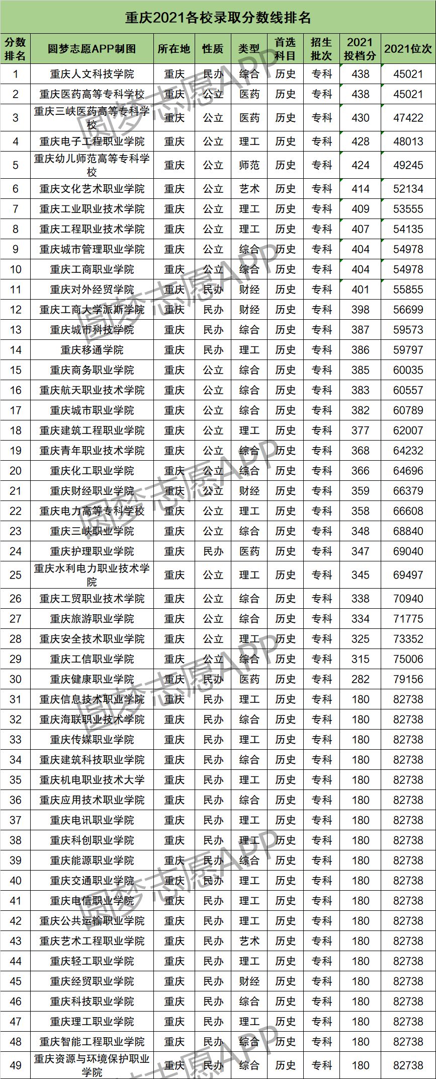 4、重庆2021各校录取分数线排名(专科首选历史)