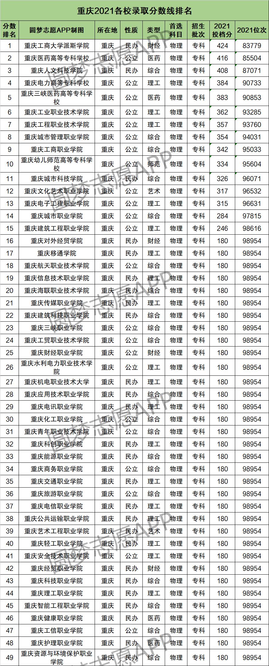 3、重庆2021各校录取分数线排名(专科首选物理)