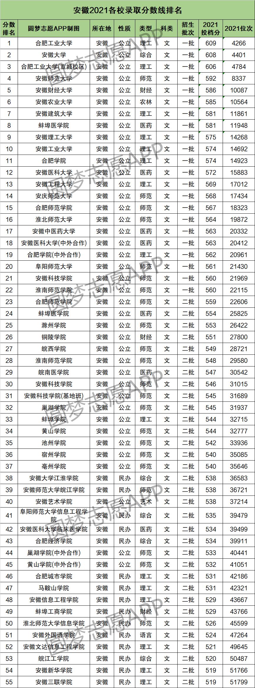 2、安徽2021各校录取分数线排名(本科文史类)