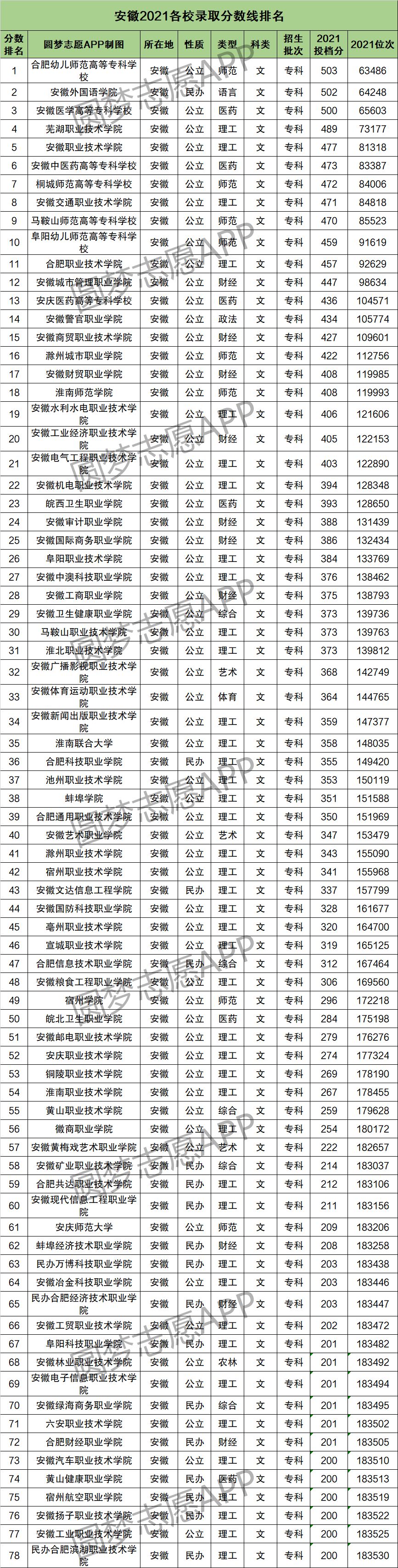 4、安徽2021各校录取分数线排名(专科文史类)