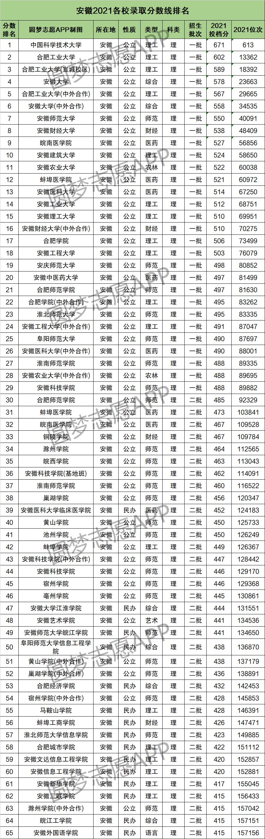 1、安徽2021各校录取分数线排名(本科理工类)